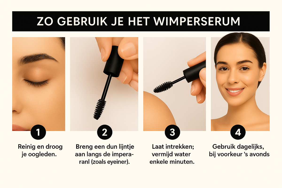 Breng ’s avonds een dun laagje aan langs de wimper- en/of wenkbrauwlijn op een gereinigd, droog huidoppervlak. De lichte textuur trekt snel in en voelt comfortabel aan , geen plakkerig residu, gewoon resultaat. Dag na dag zie je een stevigere haarbasis, sterkere groei en een vollere uitstraling die je zelf kunt bewonderen.